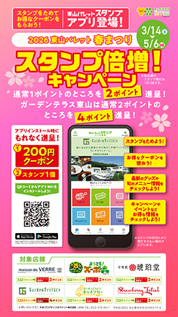 【開催期間】 2026年3月14日(土)〜5月6日(水祝) 【対象店舗】 ガーデンテラス東山、メゾン・ド・ヴェール、ようこそズーボの森 ズーボとどうぶつキッチンカー、琥珀堂、ストロベリーフェチ